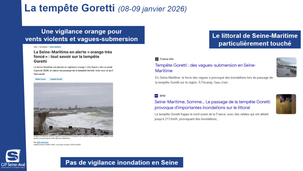 Le 09 janvier 2026, la Normandie subissait la tempête Goretti. En estuaire de Seine, de très forts vents d’ouest (100 km/h de moyenne horaire et rafales >150 km/h) ont été mesurés à l’embouchure, y générant une surcote maximale de 2 mètres à pleine mer (période de retour >100 ans) !